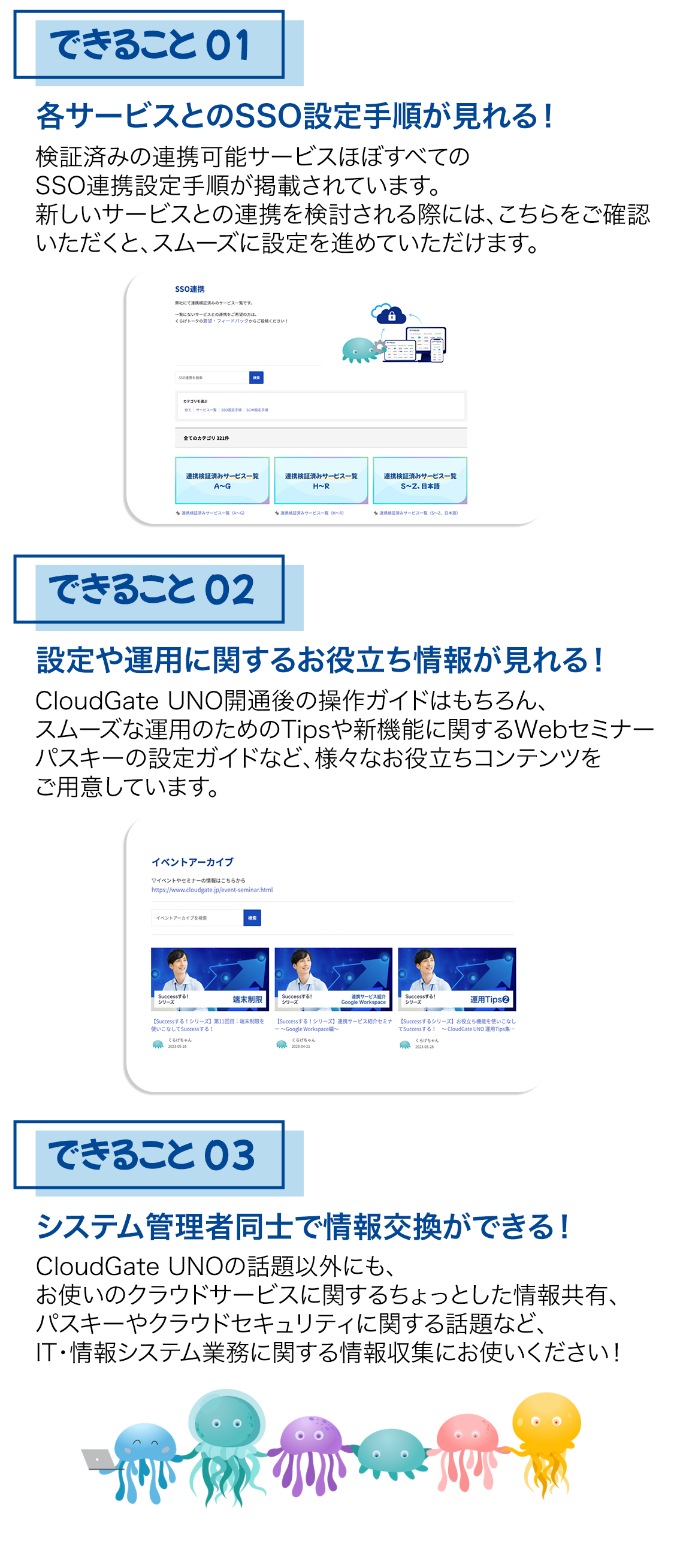 CloudGate UNO に関する様々な情報がご確認いただけるだけでなく、IT やクラウドサービスについての情報交換やお悩み相談など、管理者同士で交流もしていただける場所です。登録制コミュニティサイトのため、ログインいただくことで全てのメニューをご覧いただけます。